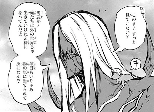 Hundreds of years ago, Hijirimaru (a Shinja) and Higano (a Deigan) viewing the outside world